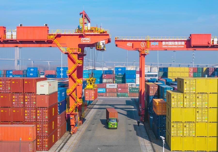14日、江蘇省泰州港のコンテナヤード。(ドローンから、泰州=新華社配信/湯徳宏)