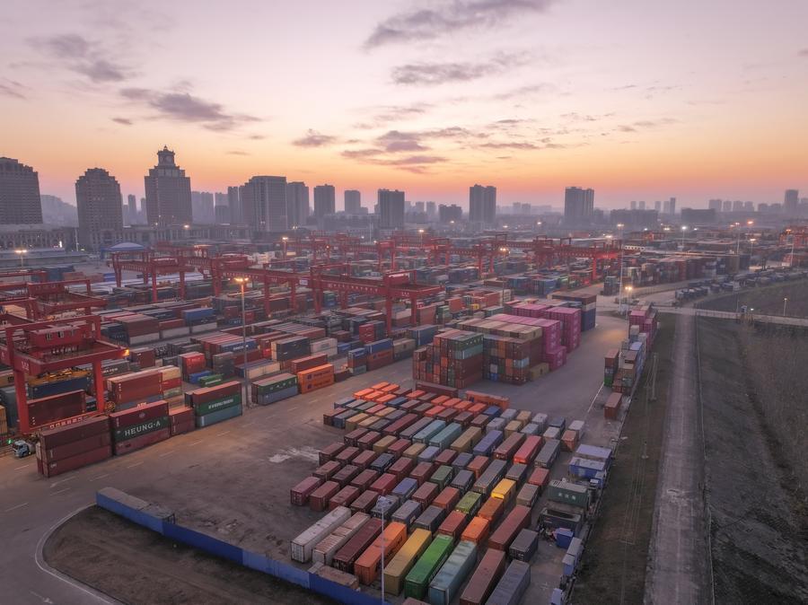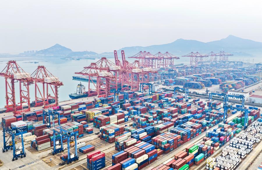 14日、山東省青島港のコンテナターミナル。(ドローンから、青島=新華社配信/兪方平)