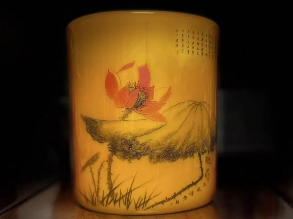 劉さんは19歳で刻瓷を体系的に学び始め、学生時代に学んだ油絵の技法を創作に取り入れてきた。現在は、高温で変色する窯変釉と刻瓷を組み合わせることで、作品の表現力をさらに広げている。