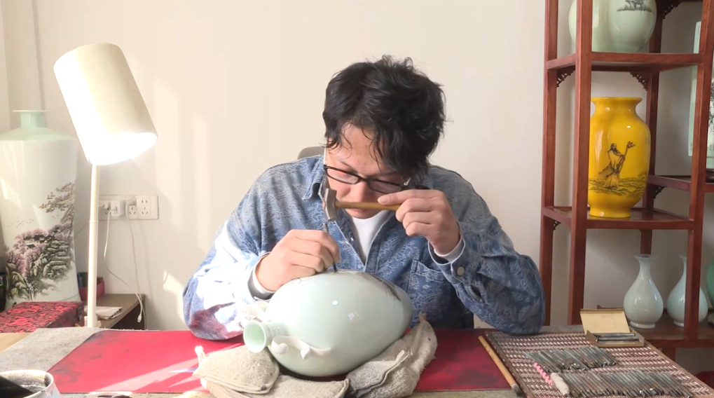 刻瓷は、硬くて壊れやすい磁器の表面に彫刻刀を用いて精緻な細工を施す高度な技法で、山東省の省級無形文化遺産に登録されている。制作者には確かな絵画力とともに、熟練した彫刻刀さばきが求められる。