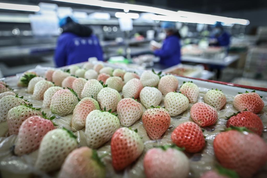 11日、遼寧省東港市の聖野漿果専門合作社(協同組合)に並ぶ包装前のイチゴ。(東港=新華社記者/潘昱竜)