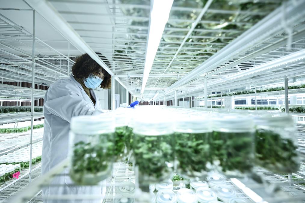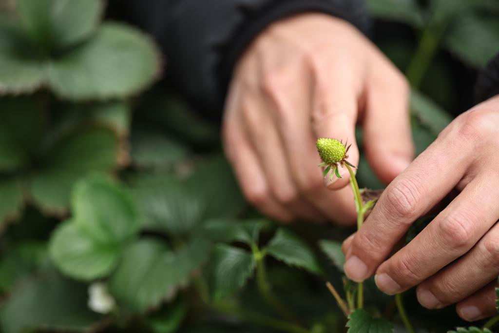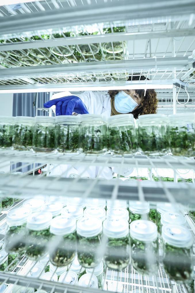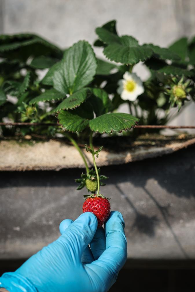 12日、遼寧イチゴ科学技術研究院で種苗の育成作業をする職員。(東港=新華社記者/潘昱竜)