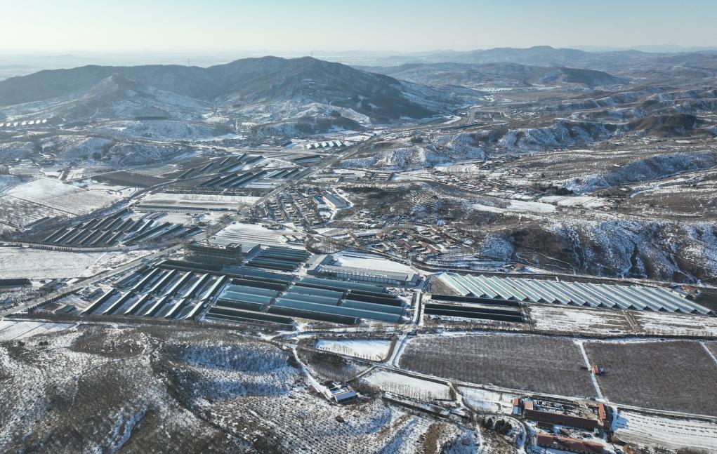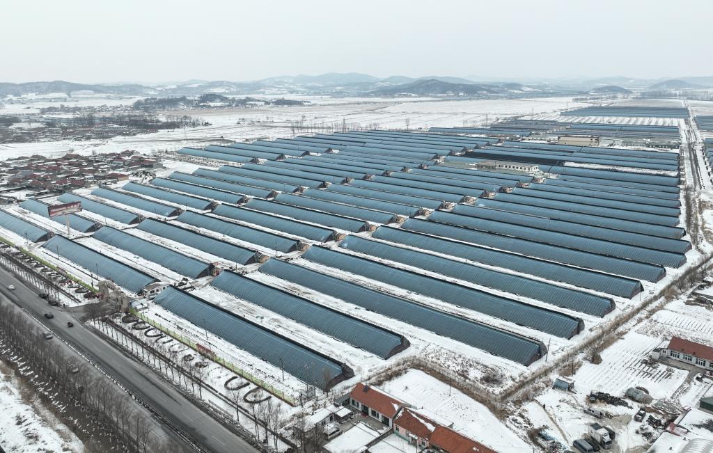 11日、遼寧省東港市のイチゴ温室。(ドローンから、東港=新華社記者/潘昱竜)