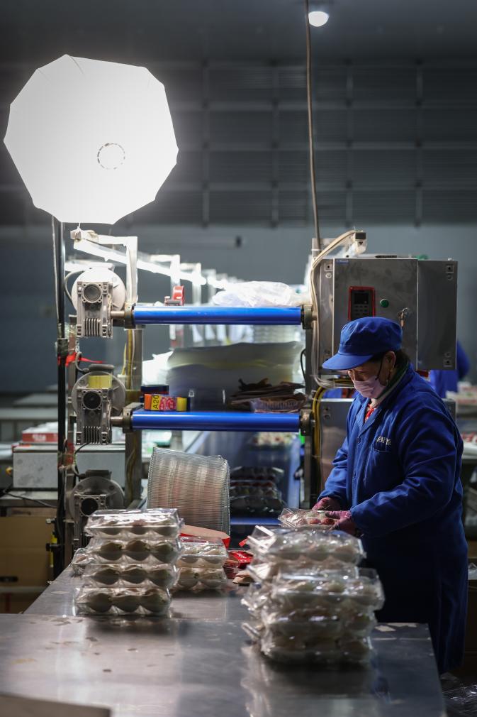 11日、遼寧省東港市の聖野漿果専門合作社(協同組合)で、摘みたてのイチゴを梱包する従業員。(東港=新華社記者/潘昱竜)