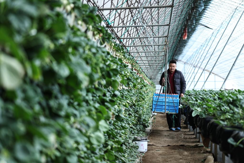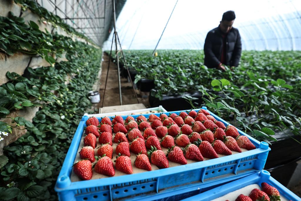 12日、遼寧省東港市の温室でイチゴを摘む生産者。(東港=新華社記者/潘昱竜)