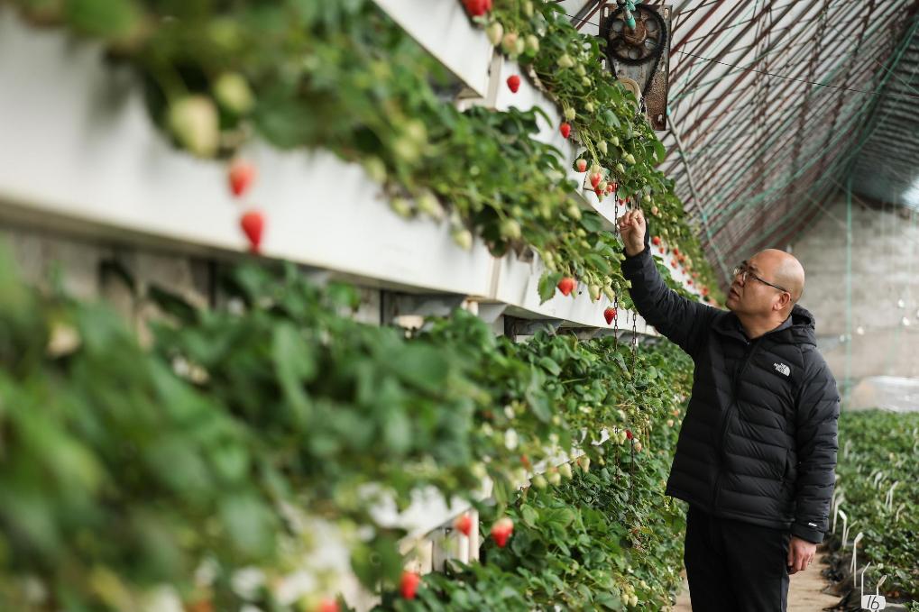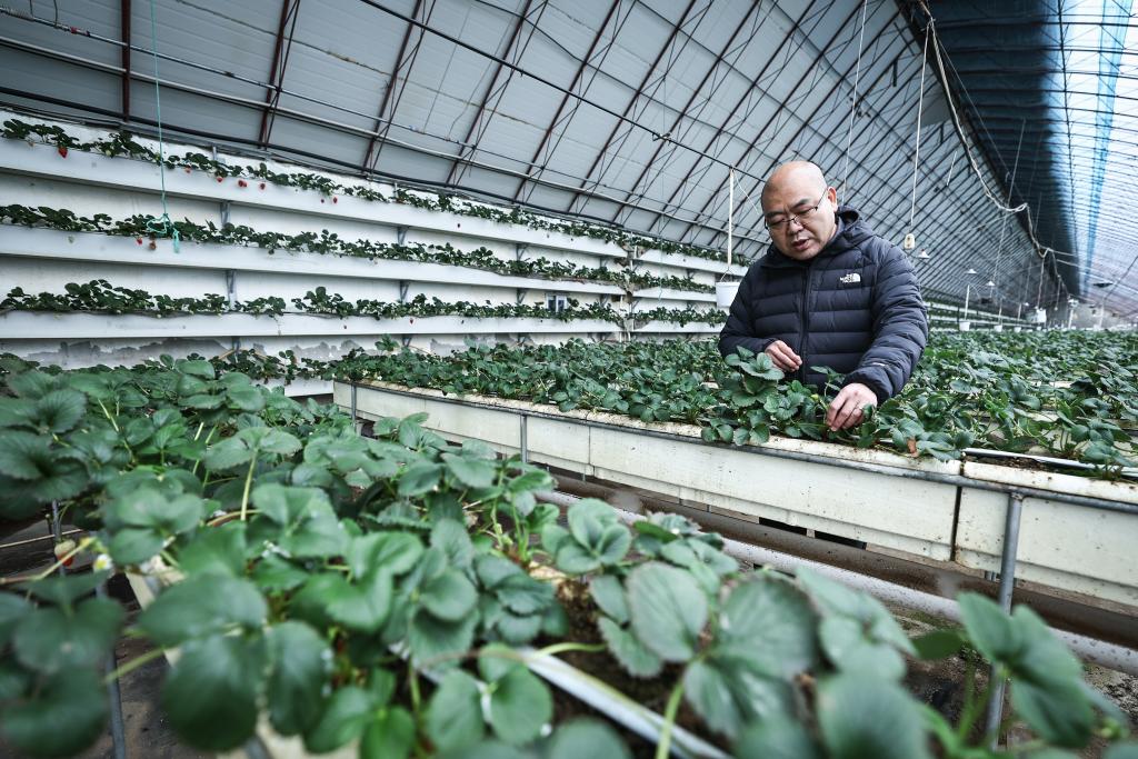 12日、遼寧イチゴ科学技術研究院の立体栽培技術展示棚で苗の生育状況を確認する刁玉峰(ちょう・ぎょくほう)副院長。(東港=新華社記者/潘昱竜)