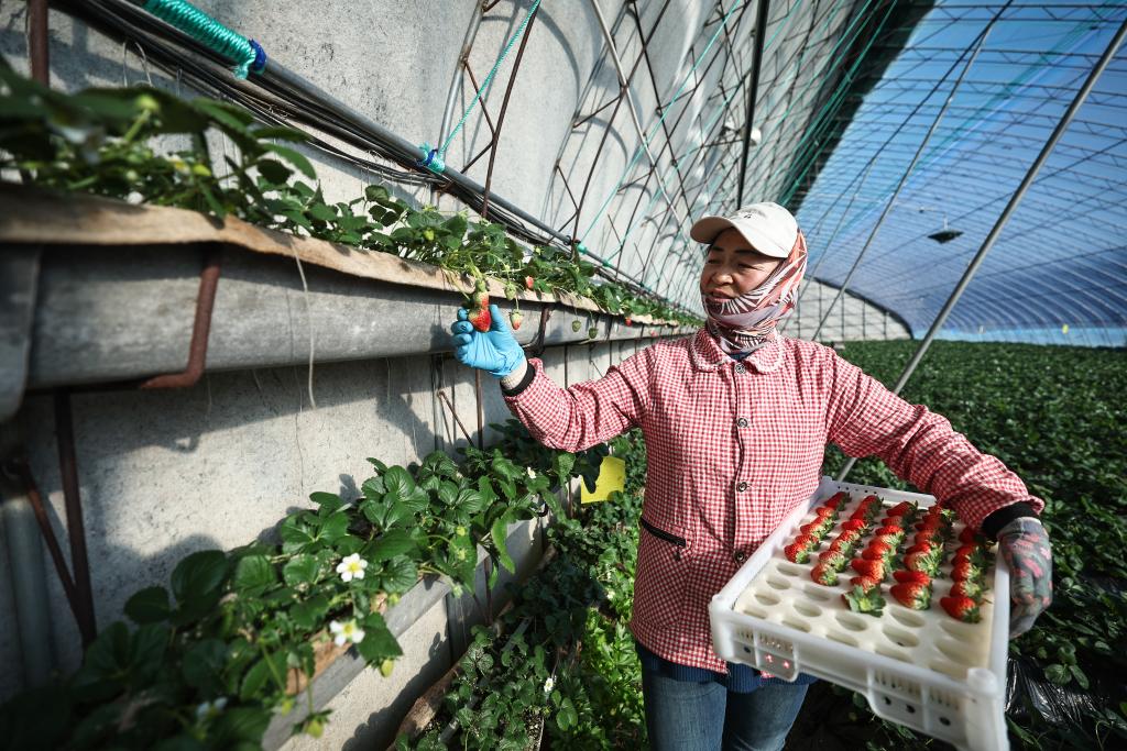 11日、遼寧省東港市の温室でイチゴを選んで摘み取る生産者。(東港=新華社記者/潘昱竜)