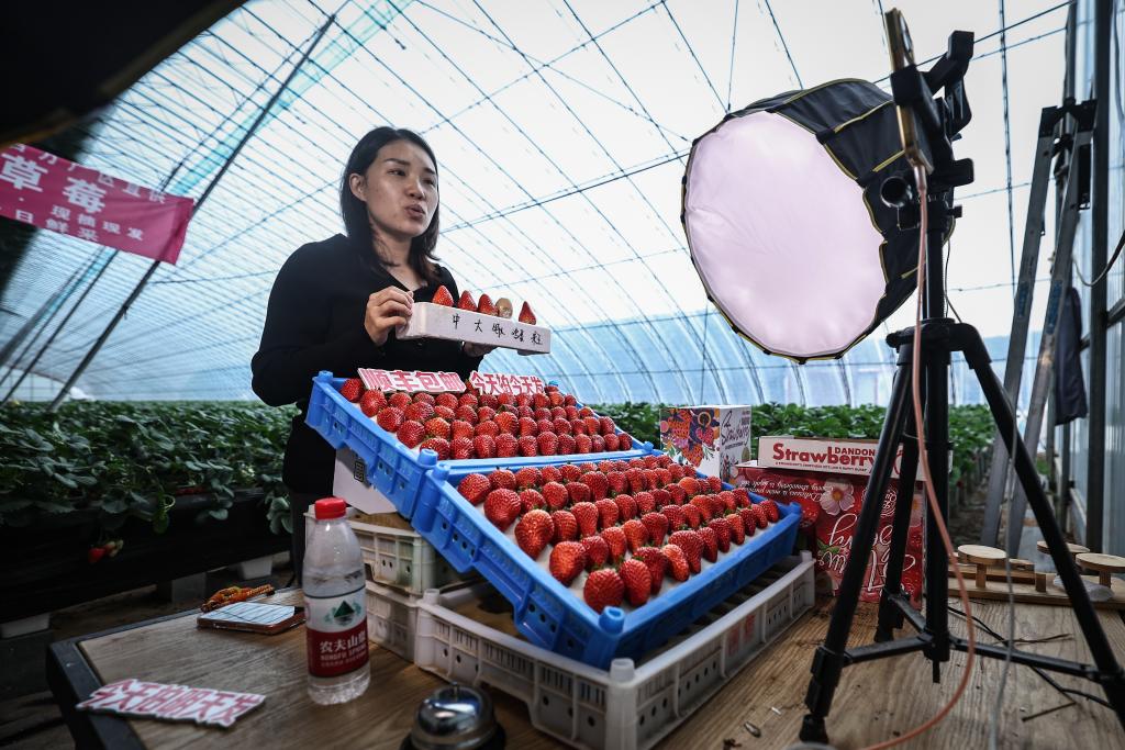 12日、遼寧省東港市の温室で、ライブコマースを通じてイチゴを販売する生産者。(東港=新華社記者/潘昱竜)