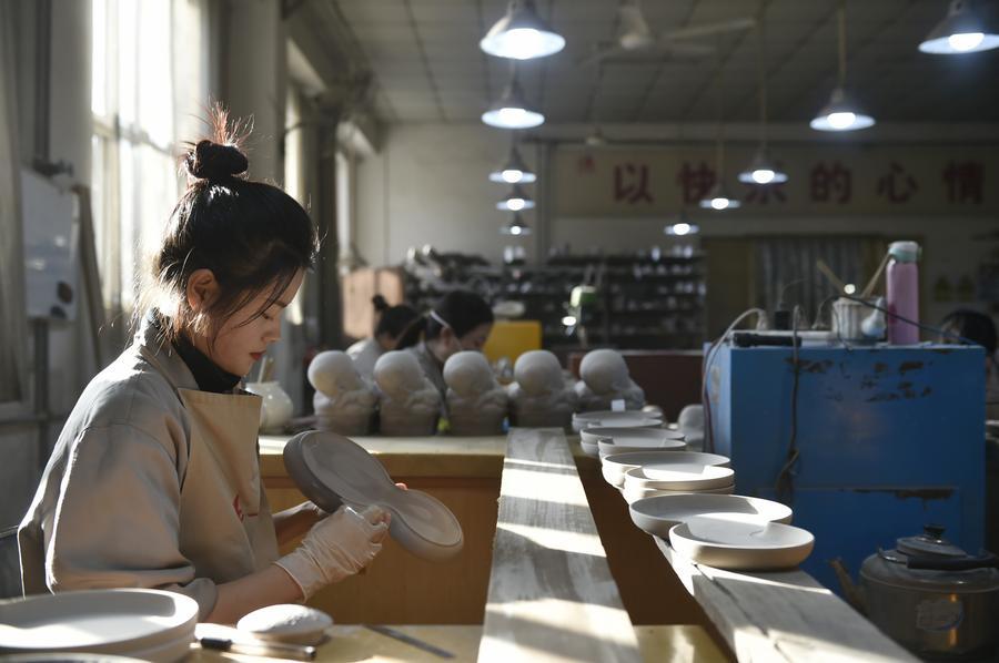 曲陽県にある定窯磁器メーカーの工場で、製品を加工する従業員。(2025年12月25日撮影、曲陽=新華社記者/魯鵬)