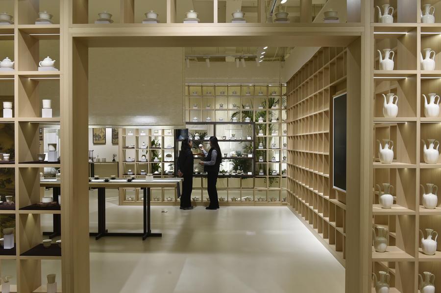 曲陽県にある定窯磁器メーカーのショールームで、製品を見る人たち。(2025年12月25日撮影、曲陽=新華社記者/魯鵬)