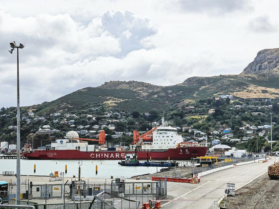 14日、ニュージーランド・クライストチャーチのリトルトン港に停泊する「雪竜」。(雪竜=新華社記者/顧天成)