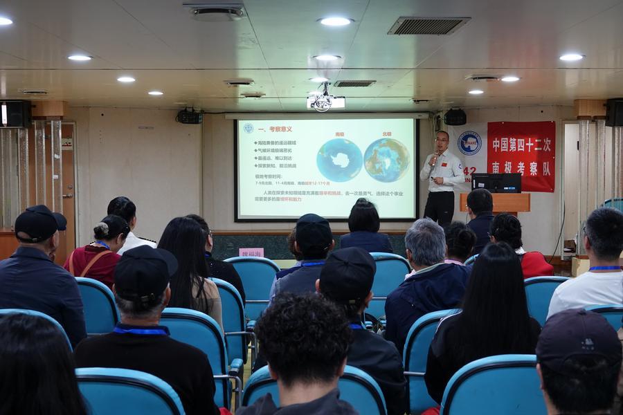 14日、「雪竜」の船内で、中国の南極観測に関する講座を聴く参加者。(雪竜=新華社記者/顧天成)
