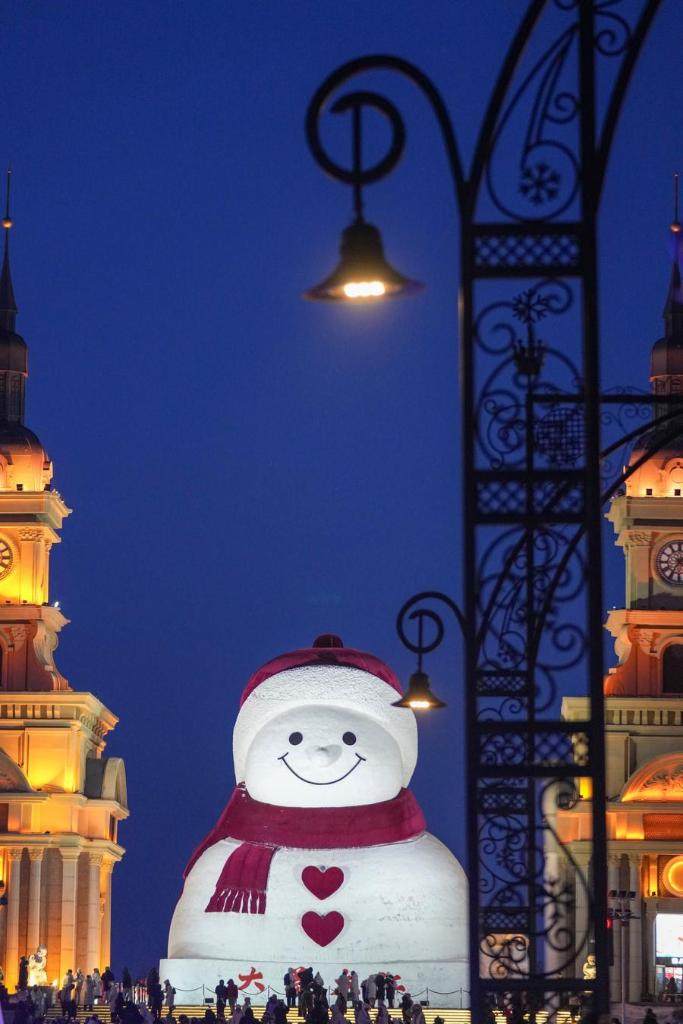 10日、ハルビン市の群力音楽公園にある巨大雪だるま。(ハルビン=新華社記者/王建威)