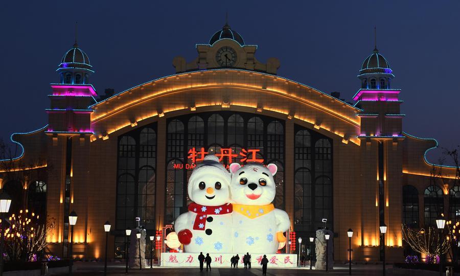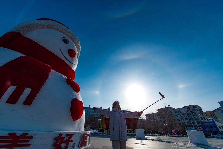 10日、黒竜江省の綏芬河駅前広場に設置されている巨大雪だるま。(綏芬河=新華社配信/曲芸偉)
