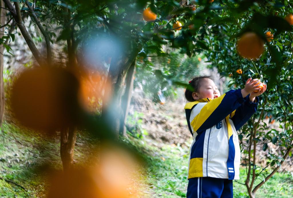 15日、かんきつ園で収穫を体験する観光客。(重慶=新華社記者/唐奕)