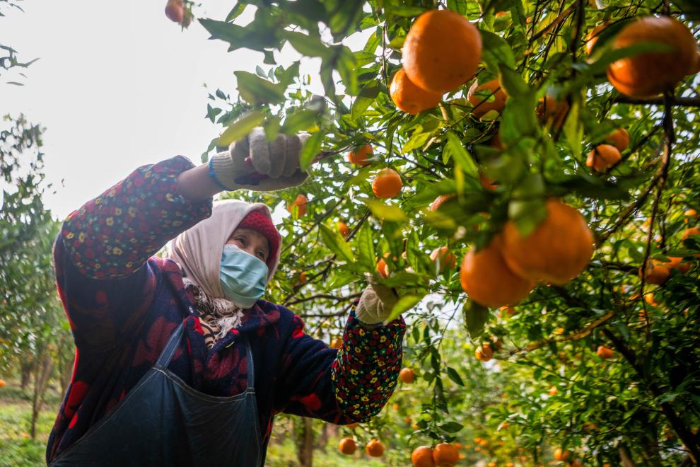 15日、かんきつ園で収穫作業に励む農家。(重慶=新華社記者/唐奕)