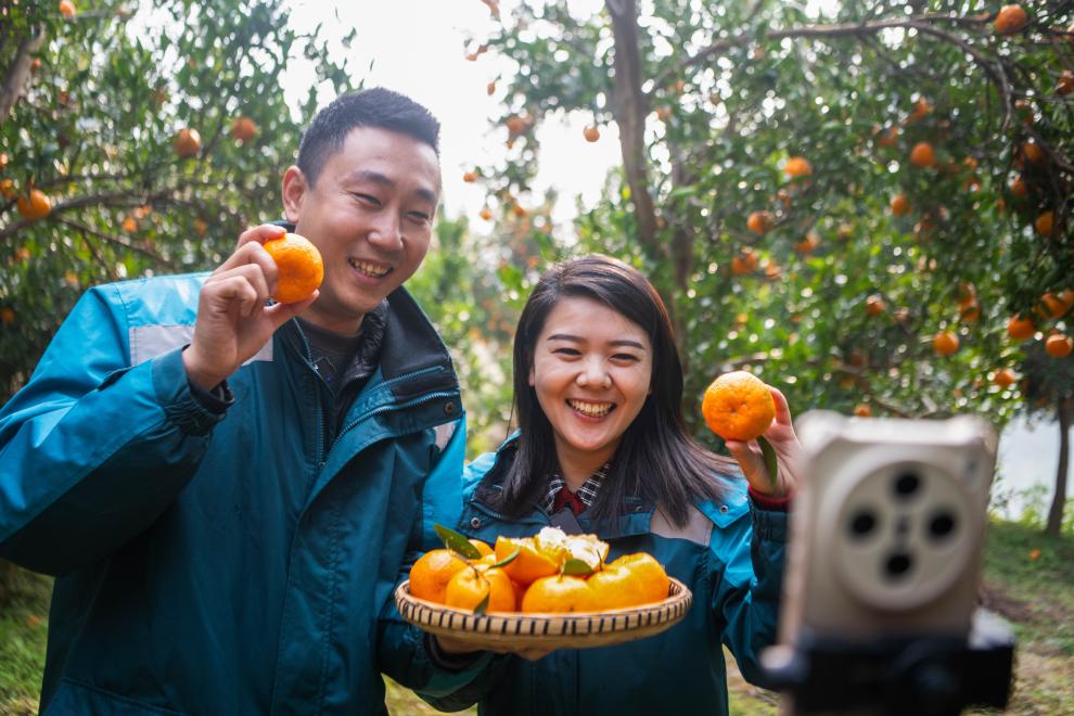 15日、かんきつ類をライブ配信で販売する農家。(重慶=新華社記者/唐奕)