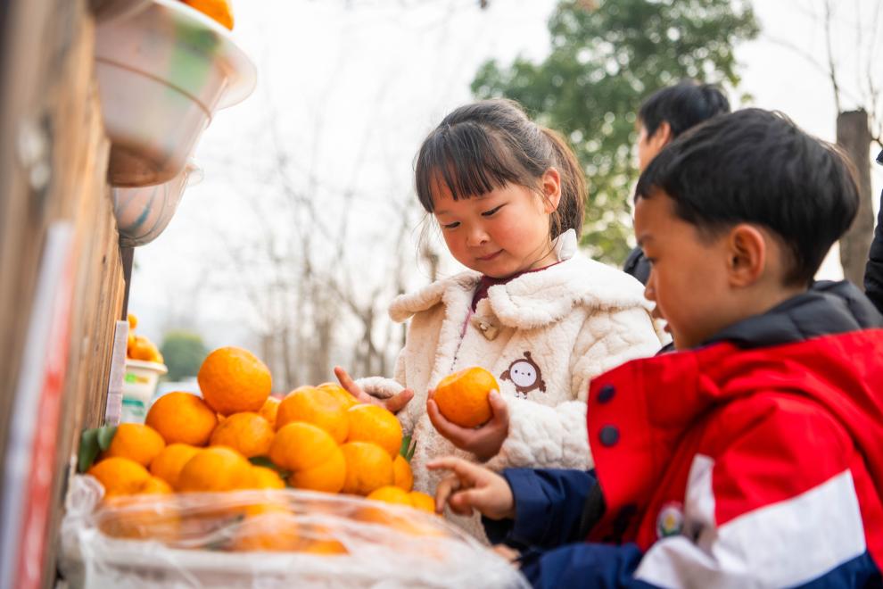 15日、阿蓬江鎮の通りで、かんきつ類を選ぶ子ども。(重慶=新華社記者/唐奕)