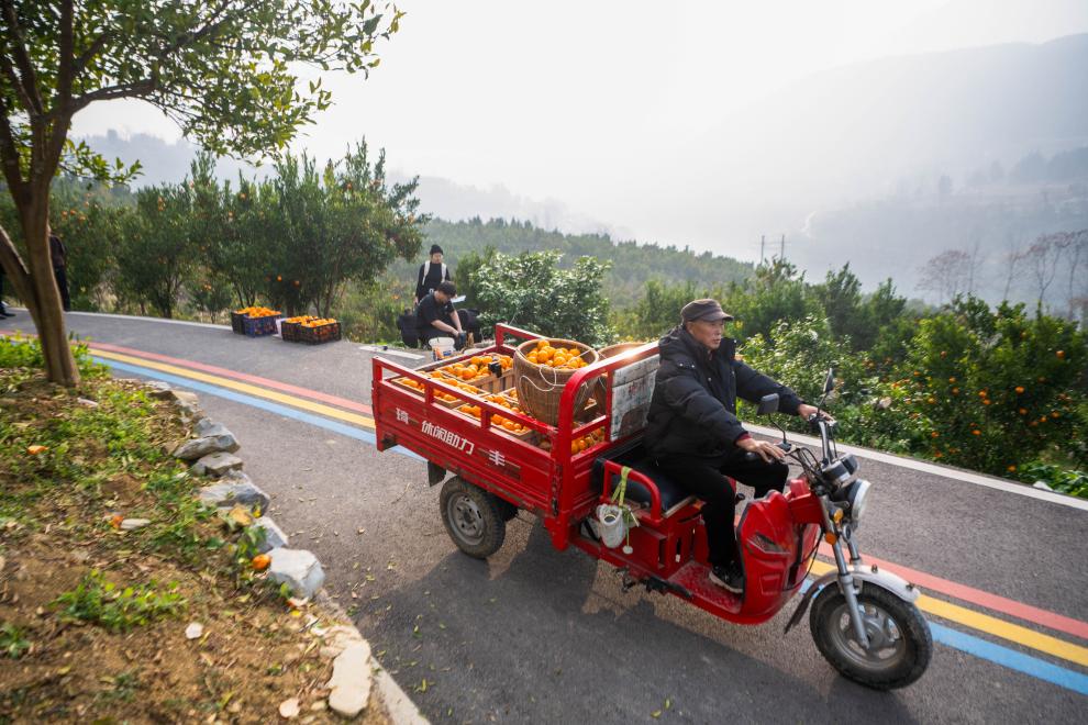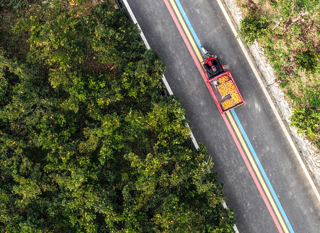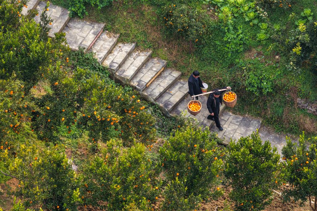 15日、収穫したかんきつ類を運ぶ農家。(ドローンから、重慶=新華社記者/唐奕)