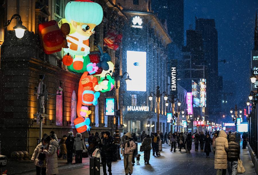 17日、天津市和平区の金街歩行街で、雪の降る中を歩く人たち。(天津=新華社記者/趙子碩)
