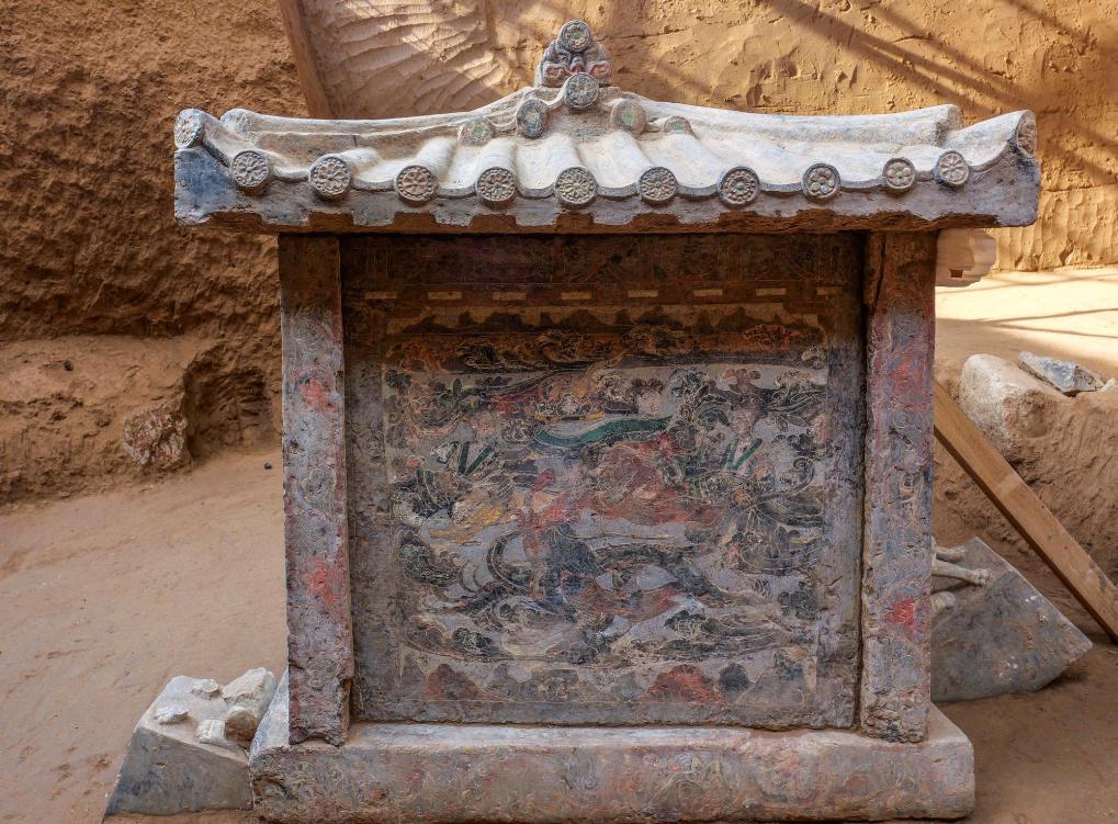 西安市百花村の北周成夫人墓から出土した房型石椁(せっかく)。(資料写真、西安=新華社配信)