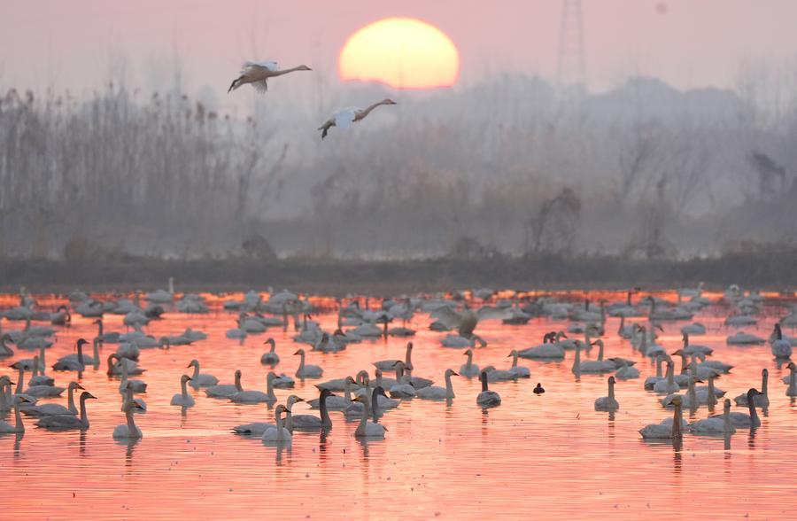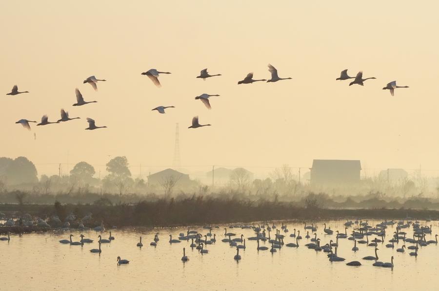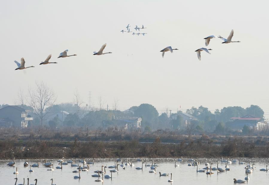 【新華社岳陽1月18日】中国湖南省岳陽市の屈原管理区にある東古湖湿地では、多くの渡り鳥が越冬のため飛来する。鳥たちが浅瀬を泳ぎ、上空を舞う姿は美しい風景の一部となっている。