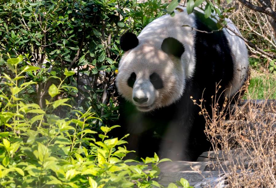 17日、屋外で遊ぶ四川省成都からやって来たパンダ「栄耀(ロンヤオ)」。(福州=新華社記者/魏培全)