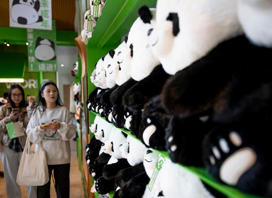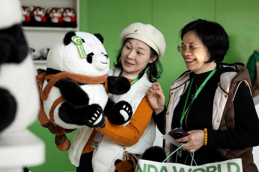 17日、福州パンダワールドの記念品売り場で製品を購入する観光客。(福州=新華社記者/魏培全)