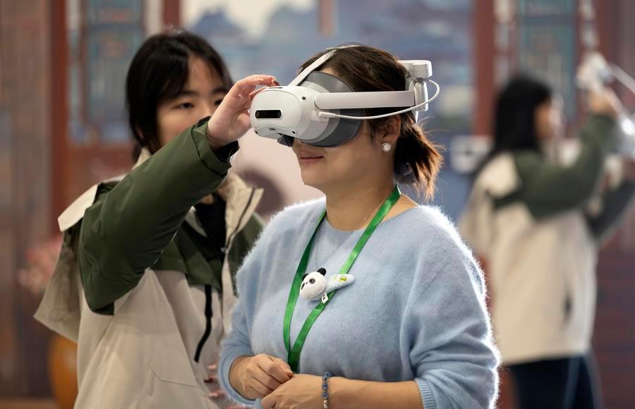 17日、仮想現実(VR)体験を楽しむ観光客。(福州=新華社記者/魏培全)