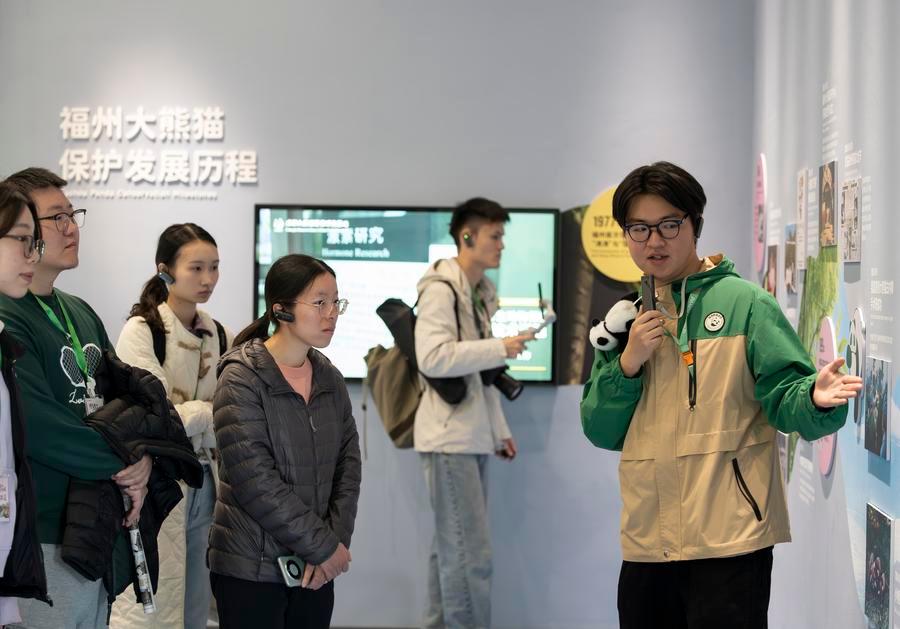 17日、職員(右)から福州のジャイアントパンダ保護の発展のあゆみについて説明を聞く観光客。(福州=新華社記者/魏培全)
