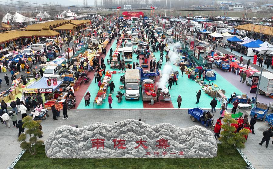 【新華社石家荘1月18日】中国河北省石家荘市元氏県では厳しい寒さの中、自由市場「南佐大集」が開かれ、にぎわいを見せた。太行山脈の麓で随一の市場には山の幸や農産物などが並び、春節(旧正月)向けの品を買い求め、名物を味わう近隣住民らで活気づいている。