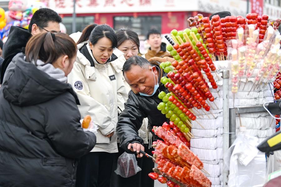 14日、南佐大集で糖葫蘆(タンフールー)を買い求める観光客。(石家荘=新華社記者/楊世尭)