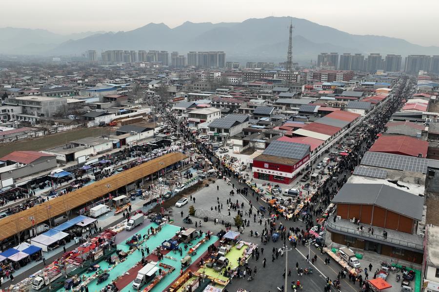 14日、買い物客でにぎわう南佐大集。(ドローンから、石家荘=新華社記者/楊世尭)
