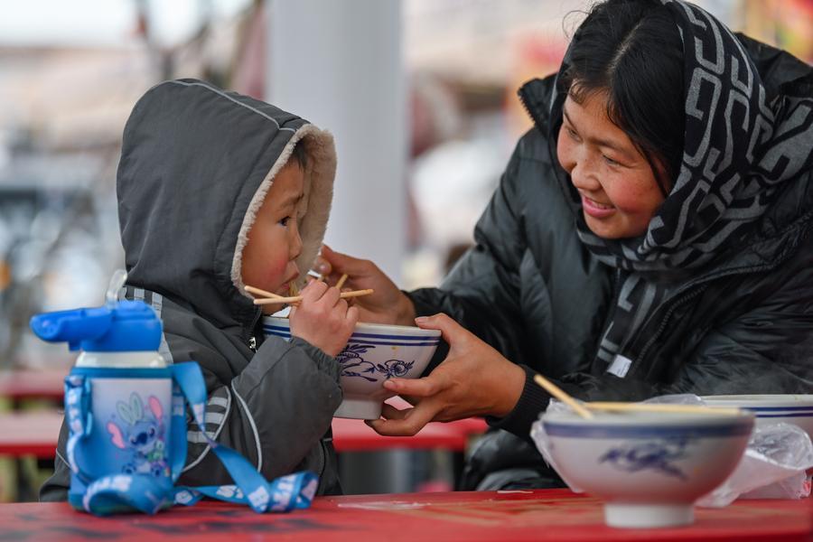 14日、南佐大集で子どもに地元の軽食を食べさせる女性。(石家荘=新華社記者/楊世尭)