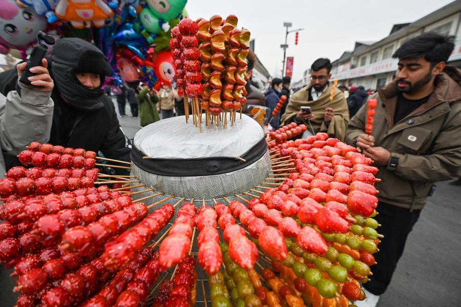 14日、南佐大集で糖葫蘆(タンフールー)を買い求める観光客。(石家荘=新華社配信/張暁峰)