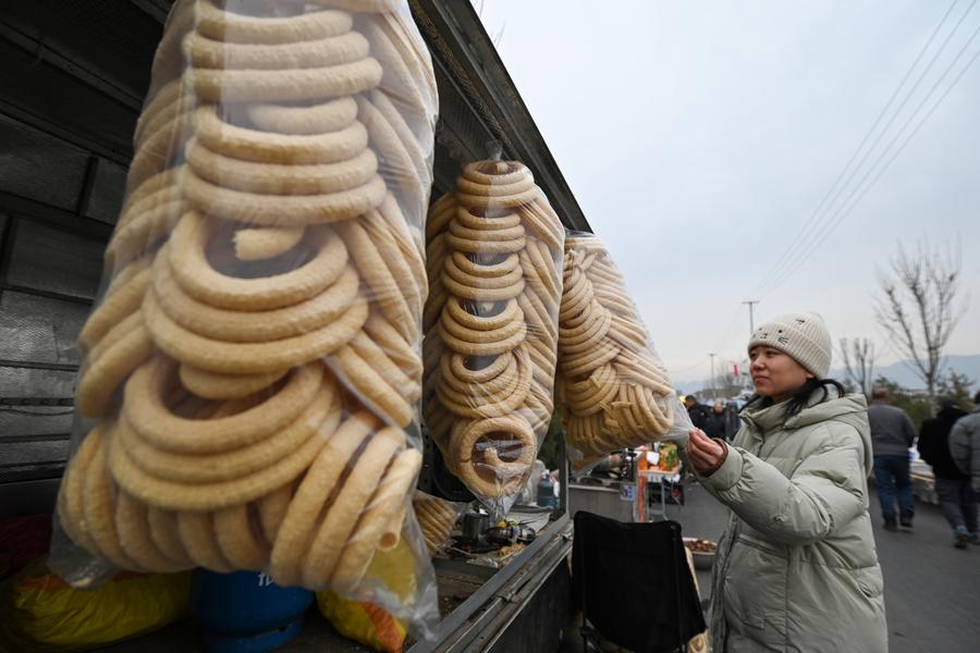 14日、南佐大集で軽食を買い求める女性。(石家荘=新華社配信/張暁峰)