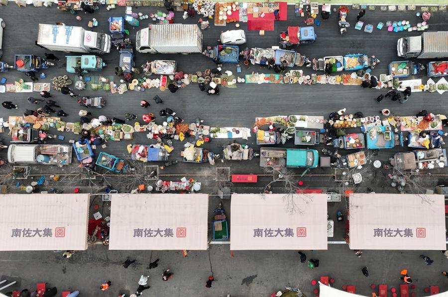 14日、買い物客でにぎわう南佐大集。(ドローンから、石家荘=新華社配信/梁子棟)