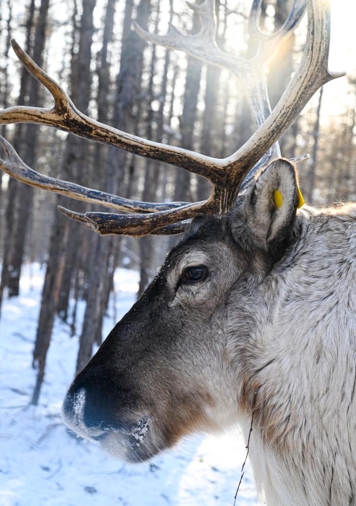15日、根河市オルグヤ・エベンキ民族郷のオルグヤ使鹿集落風景区で撮影したトナカイ。(フルンボイル=新華社記者/徐嘉懿)