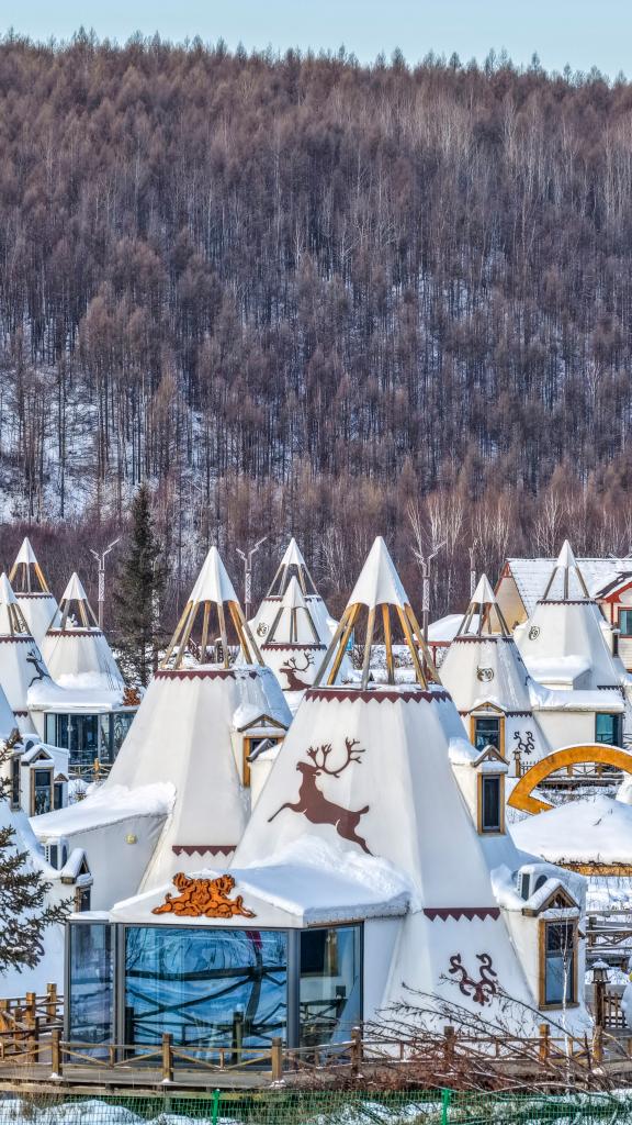 15日、根河市オルグヤ・エベンキ民族郷に並ぶエベンキ族の伝統的な住居「撮羅子」。(フルンボイル=新華社記者/馬金瑞)