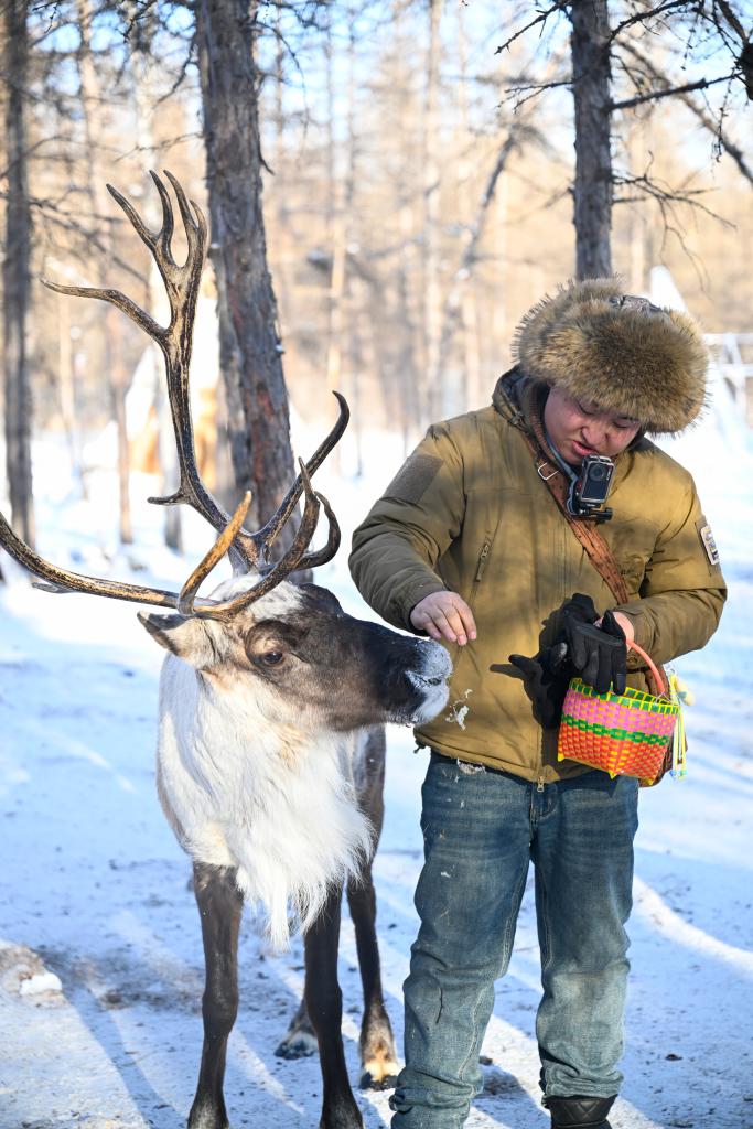 15日、根河市オルグヤ・エベンキ民族郷でトナカイに餌をやる観光客。(フルンボイル=新華社記者/連振)