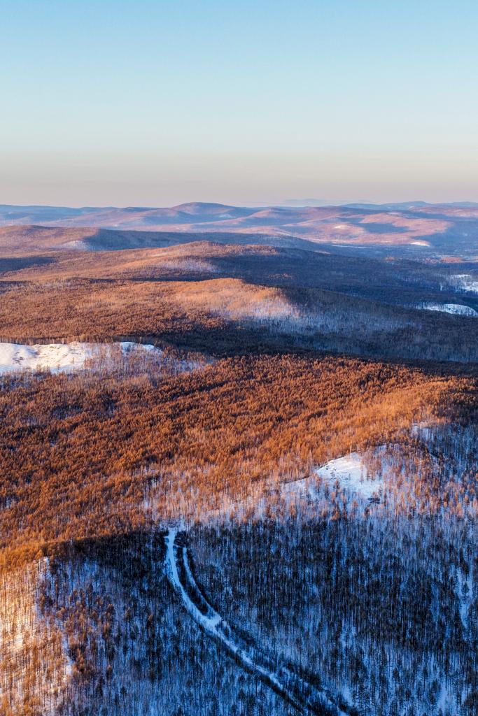 14日、根河市郊外に広がる森林。(ドローンから、フルンボイル=新華社記者/連振)