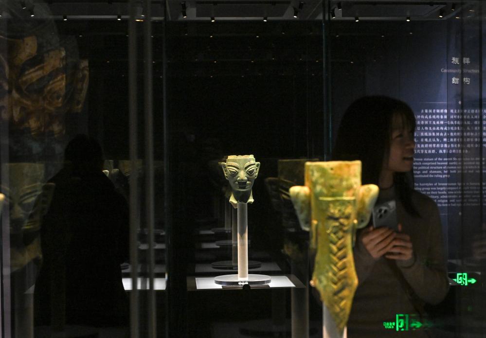 18日、会場に展示された青銅人頭像。(北京=新華社記者/金良快)