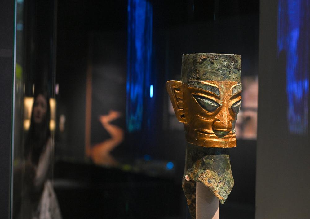 18日、会場に展示された黄金の仮面を着けた青銅人頭像。(北京=新華社記者/金良快)
