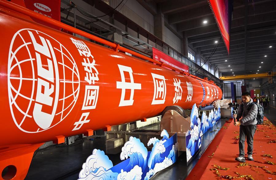 16日、中国鉄建大橋工程局集団が投資、建造した開閉油圧シリンダーの完成記念式典。(南京=新華社記者/季春鵬)