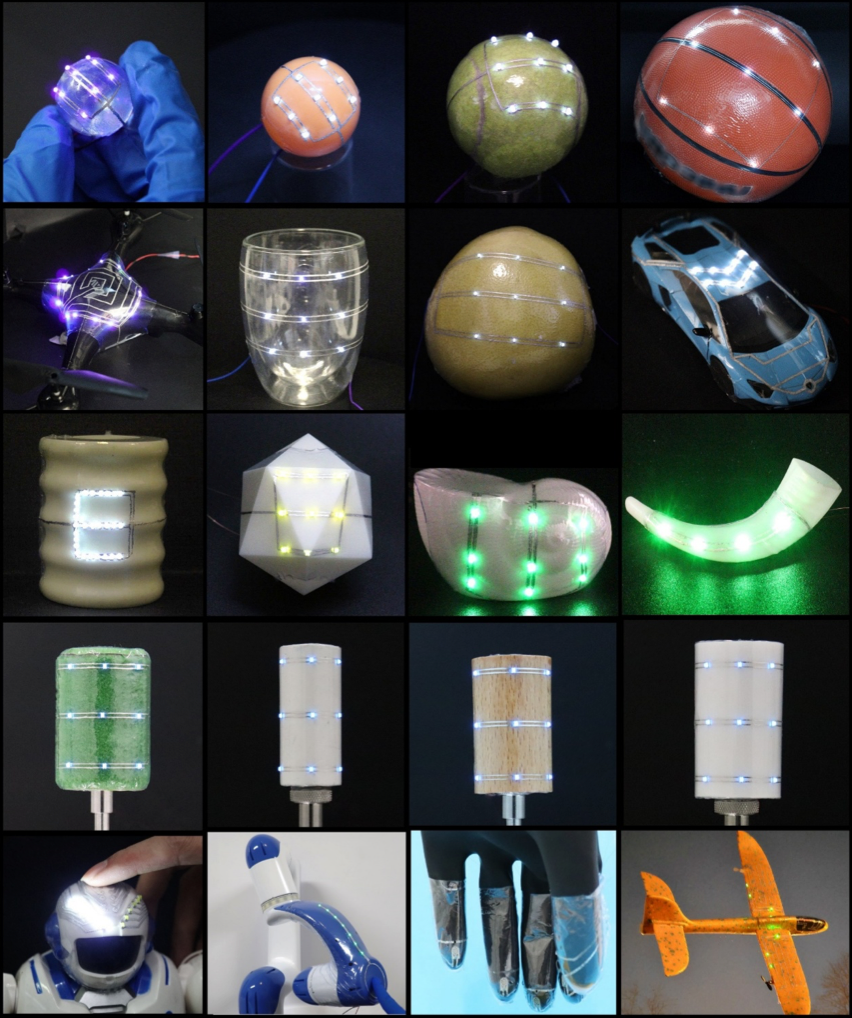 この技術により、平面上の回路は約70度の温水や熱風で処理することで、リンゴや飛行機の翼、指先にも、あらかじめ設計された変形パターンに沿って素早く適応し、密着できる。