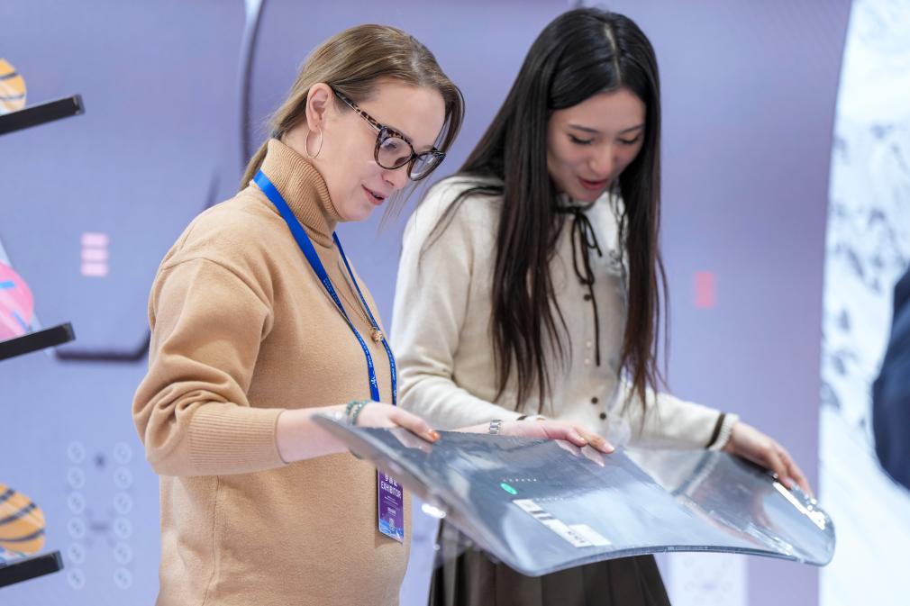 2026ハルビン国際氷雪経済博覧会で、来場者にスマートカーボンファイバー製スノーボード板の性能を紹介する出展者(左)。(1月6日撮影、ハルビン=新華社記者/王松)