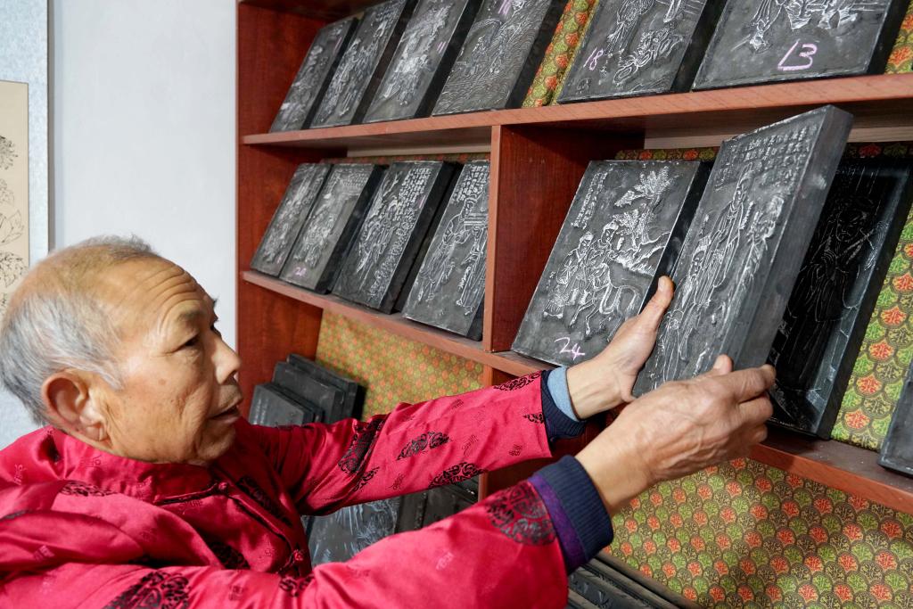 9日、山東省高密市の東李家荘村で、高密木版年画の木版を整理する代表的伝承者の李連中(り・れんちゅう)さん。(高密=新華社配信/李海濤)