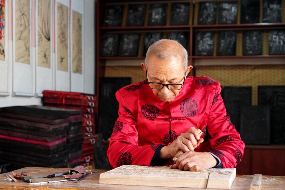 10日、山東省高密市の朱家村で、高密木版年画を制作する代表的伝承者の斉伝新(せい・でんしん)さん。(高密=新華社配信/李海濤)