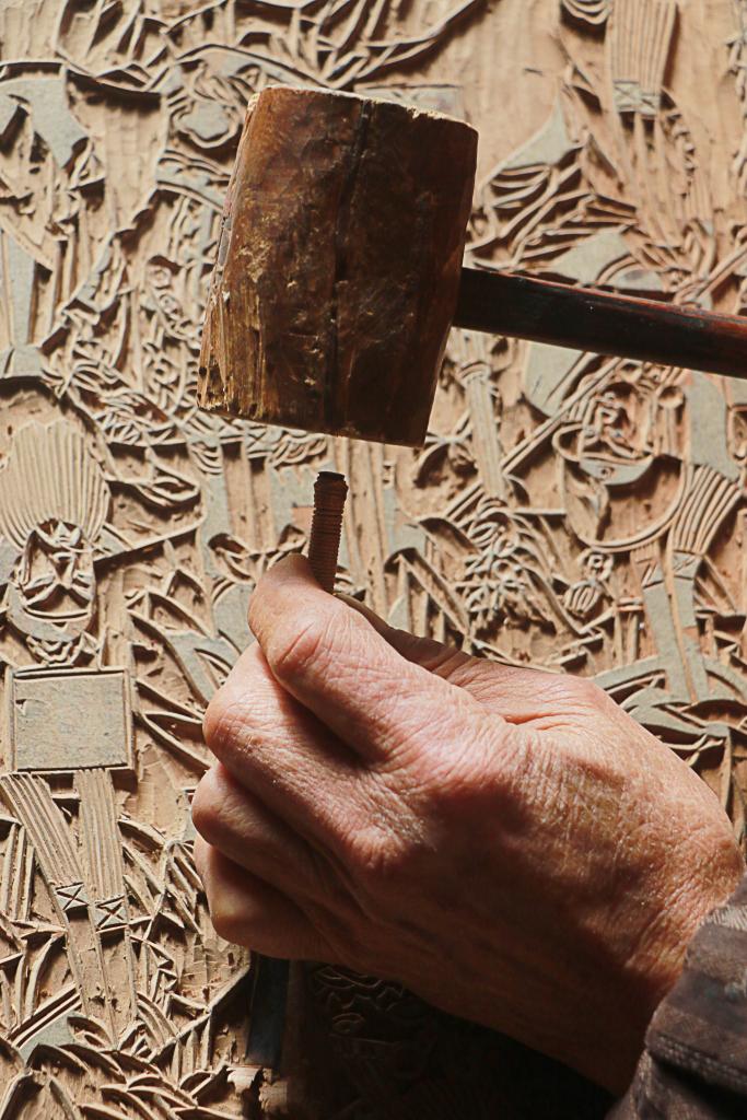 10日、山東省高密市の朱家村で、高密木版年画の代表的伝承者、斉伝新(せい・でんしん)さんが手がける版木。(高密=新華社配信/李海濤)