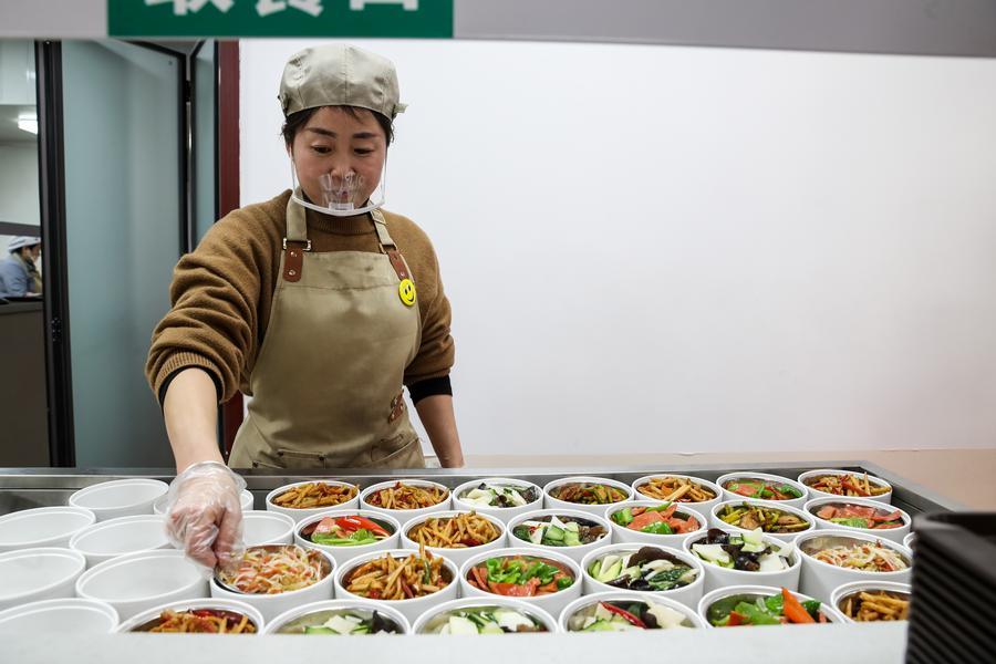 17日、甘粛省隴南市両当県の共有食堂で、加熱台の上に料理を並べるスタッフ。(隴南=新華社記者/郎兵兵)